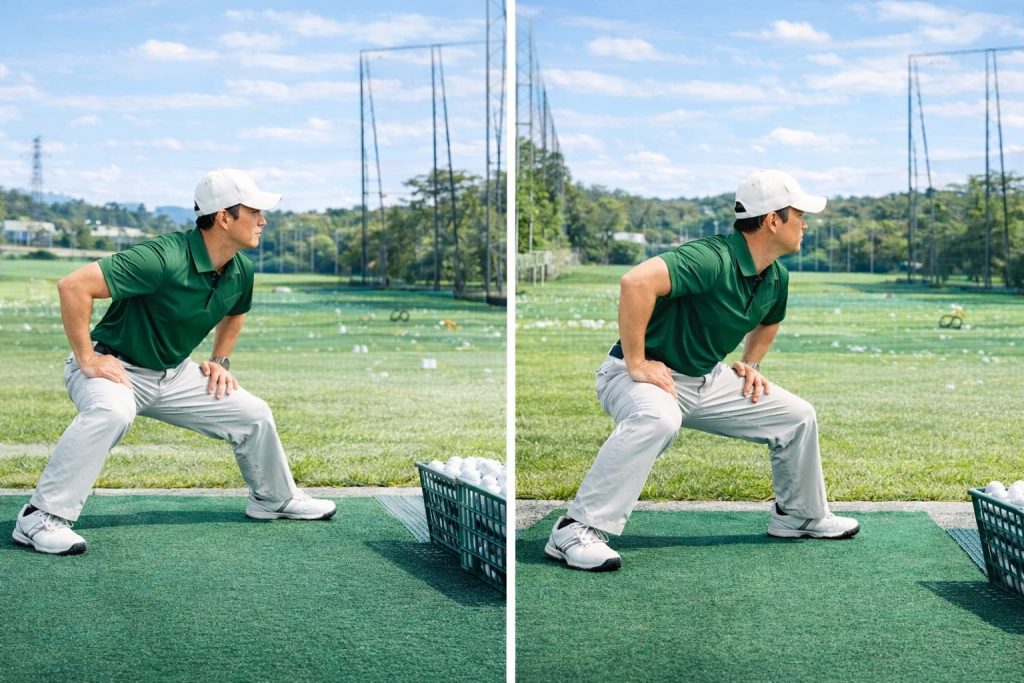 上半身ばかりに意識が向きがちですが、スイングの土台を作っているのは下半身です。特に股関節が硬い状態では、体が突っ込んだり、バランスを崩したりしやすくなります。