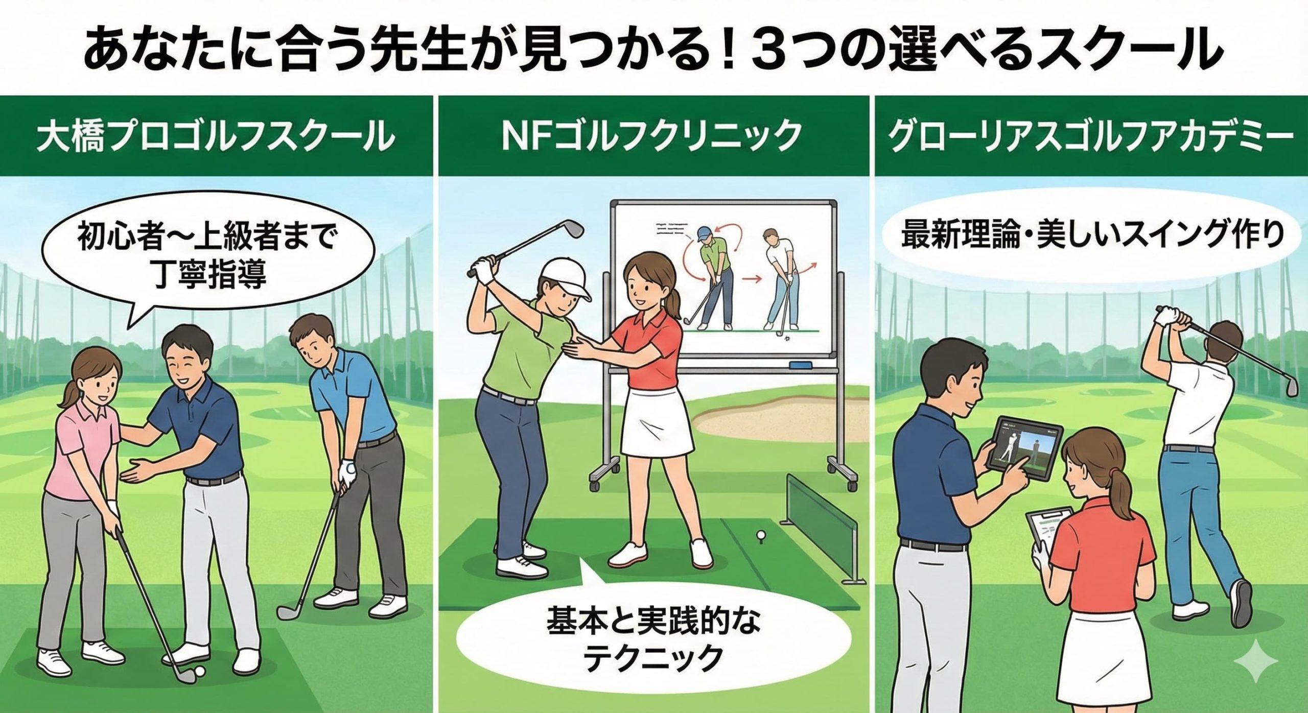 厚木ゴルフプラザの最大の特徴は、指導方針の異なる3つのゴルフスクールが開講されていることです。
