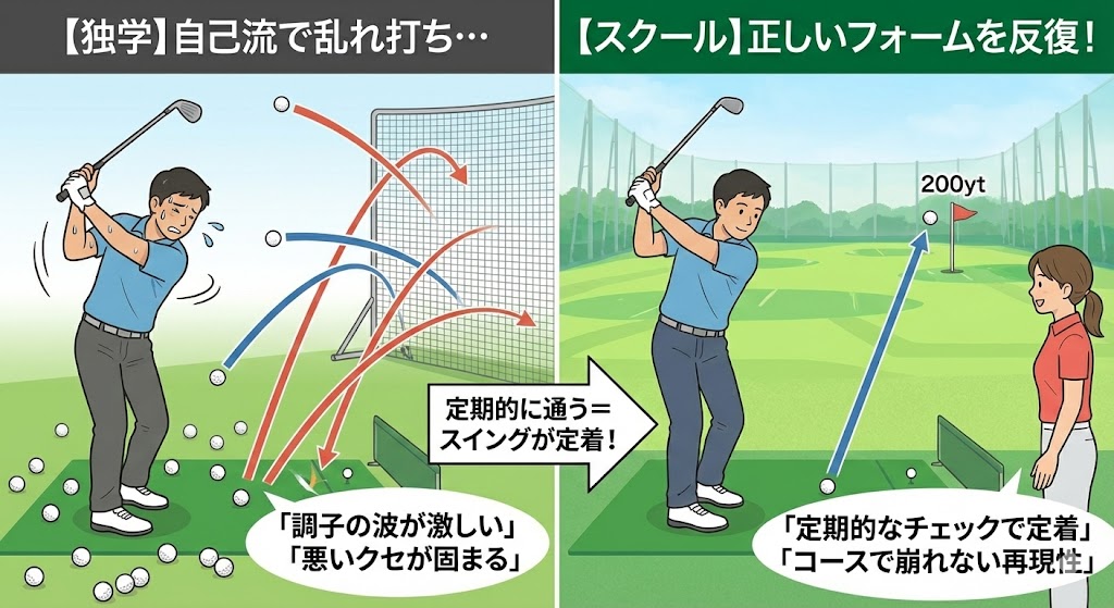 スクールに入ると、決まった日時に「正しいフォームで打つ時間」が確保されます。